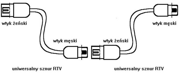 Sznur przyłączeniowy „antenowy” koncentryczny o impedancji falowej 75 Ω (rys. poniżej), łączy ścienne gniazdo AZART lub tradycyjnej telewizji kablowej z odbiornikiem. Jest to sznur uniwersalny. Łączy otwór oznaczony „TV” gniazda ściennego z telewizorem. Taki sam sznur po odwróceniu kierunku, łączy otwór oznaczony „R” gniazda ściennego z radiem.