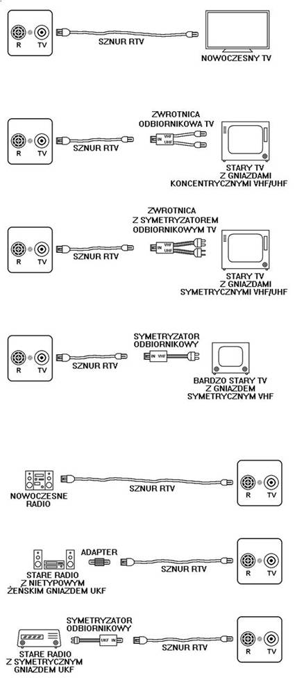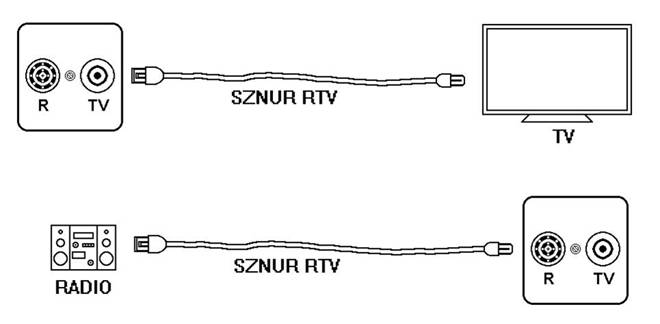 Do jednego gniazda można podłączyć równocześnie radio i telewizor (rys. poniżej). Radio powinno być przystosowane do odbioru sygnału UKF-FM w paśmie 87,5…108 MHz, przy czym dostępne jest tu pasmo co najmniej 87,5…230 MHz dla ewentualnej radiofonii T-DAB+. W torze telewizyjnym dostępne jest pasmo co najmniej 110…862 MHz.
