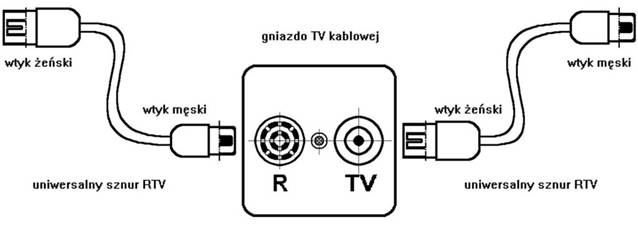 Sznur przyłączeniowy „antenowy” koncentryczny o impedancji falowej 75 Ω (rys. poniżej), łączy ścienne gniazdo AZART lub tradycyjnej telewizji kablowej z odbiornikiem. Jest to sznur uniwersalny. Łączy otwór oznaczony „TV” gniazda ściennego z telewizorem. Taki sam sznur po odwróceniu kierunku, łączy otwór oznaczony „R” gniazda ściennego z radiem.