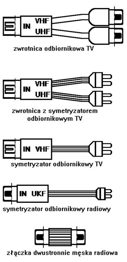Niektóre stare odbiorniki mają nietypowe gniazda antenowe. W tym przypadku po stronie odbiornika stosujemy nasadzany na sznur, odpowiedni adapter (rys. poniżej), dostosowujący właściwą wtyczkę uniwersalnego sznura do nietypowego gniazda starego odbiornika. W szczególności tym adapterem może być symetryzator odbiornikowy telewizyjny, lub radiowy, a w przypadku radia z nietypowym (żeńskim) wejściem antenowym 75 Ω, złączka dwustronnie męska.
