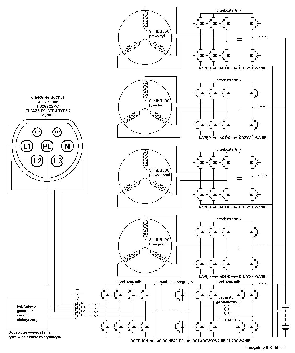 Na rysunku poniżej, przedstawiono schemat obwodów mocy EV zawierający podstawowe okablowanie „siłowe”. a w tym falowniki generujące przebieg trójpasmowy dla silników BLDC (BrushLess DC Motors) z uzwojeniami skojarzonymi w gwiazdę. Nie ujęto tu sterowania. Między innymi nie pokazano czujników, jak np. hallotronów, termistorów i innych. Nie pokazano też sterowników realizujących chłodzenie, elektroniczny dyferencjał, odzyskiwanie energii hamowania, wektorowanie momentu obrotowego i inne formy kontroli trakcji, ładowanie akumulatora (PLUG-IN), zapewnienie separacji galwanicznej pomiędzy obwodami związanymi ze złączem ładowania EV, a pozostałymi obwodami, w tym sterującymi.