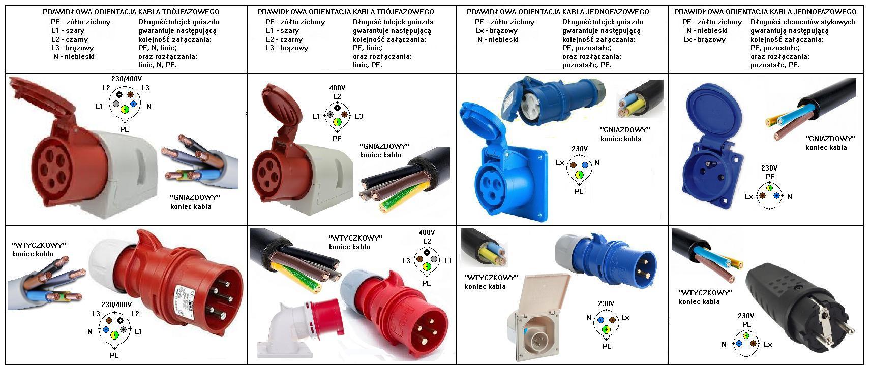 przemysłem). W kolumnie 3. pokazano złącza jednofazowe (znane głównie z dziedziny
