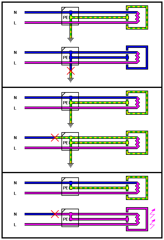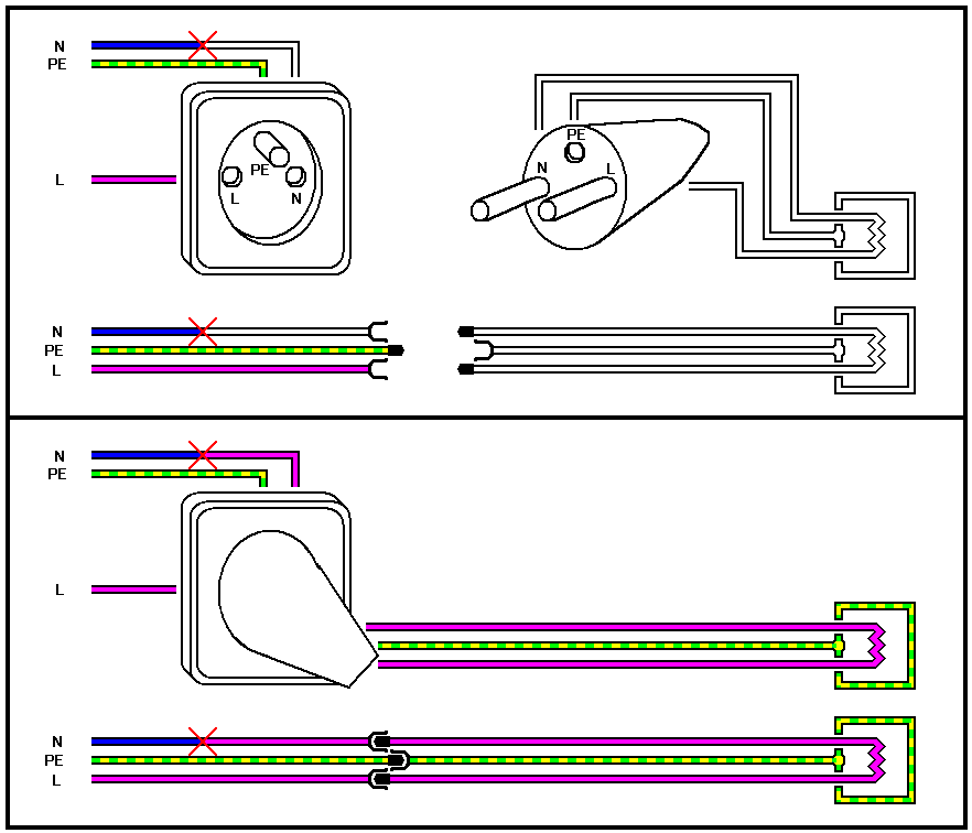 1. Dlaczego, ze względu na bezpieczeństwo przeciwporażeniowe (choć nie tylko z tego względu), do bolca „uziemiającego” w gnieździe 230 V trzeba doprowadzić od tablicy mieszkaniowej osobny przewód ochronny tak zwany PE oznaczony dwoma równocześnie występującymi kolorami żółtym i zielonym, a nie wolno „zerować” bolca lokalnie przy gnieździe do przewodu zerowego oznaczonego kolorem niebieskim?